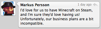 Вскоре, после того как сотрудники Valve передали шапку Нотчу в игре Team Fortress 2, начали плестись слухи о том, что вскоре MineCraft перейдет на платформу STEAM. |