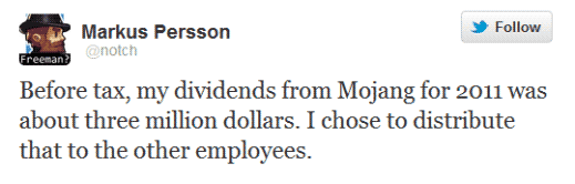 По итогам 2011 финансового года компания Mojang получила неплохую прибыль, и её главный акционер и основатель Маркус Перссон (Нотч) решил разделить три миллиона долларов между сотрудниками компании Mojang. |